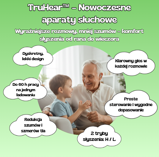 TruHear™ to nowoczesne aparaty słuchowe, które wzmacniają mowę i jednocześnie redukują hałas tła, dzięki czemu rozmowy stają się czystsze i bardziej naturalne.